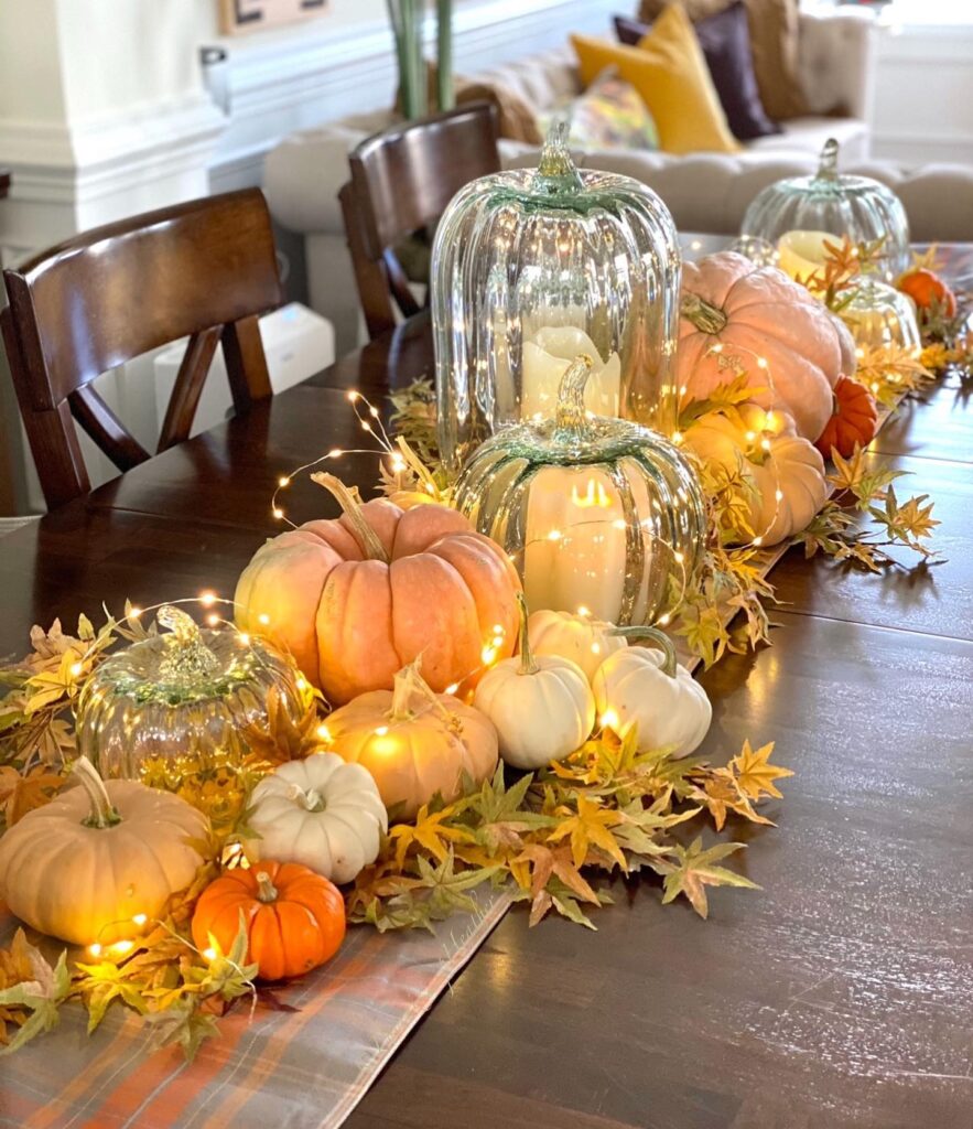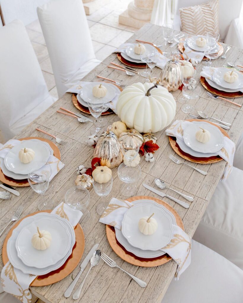 A white pumpkin tablescape feels fresh, modern, and elegant. White pumpkins pair beautifully with greenery, gold accents, or natural wood elements. This style works especially well for minimalist or farmhouse-inspired homes.