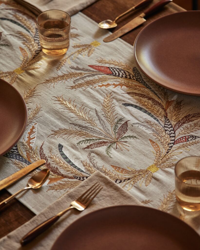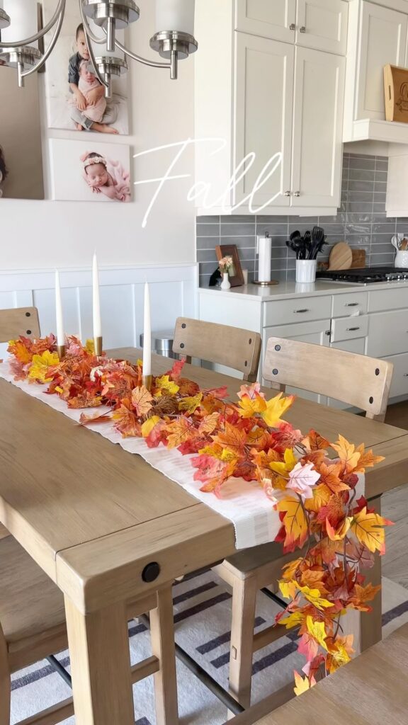 An autumn leaf runner celebrates the beauty of the season with natural charm. Use faux or real leaves arranged down the center of the table. The rich colors instantly bring warmth and a classic fall feel.