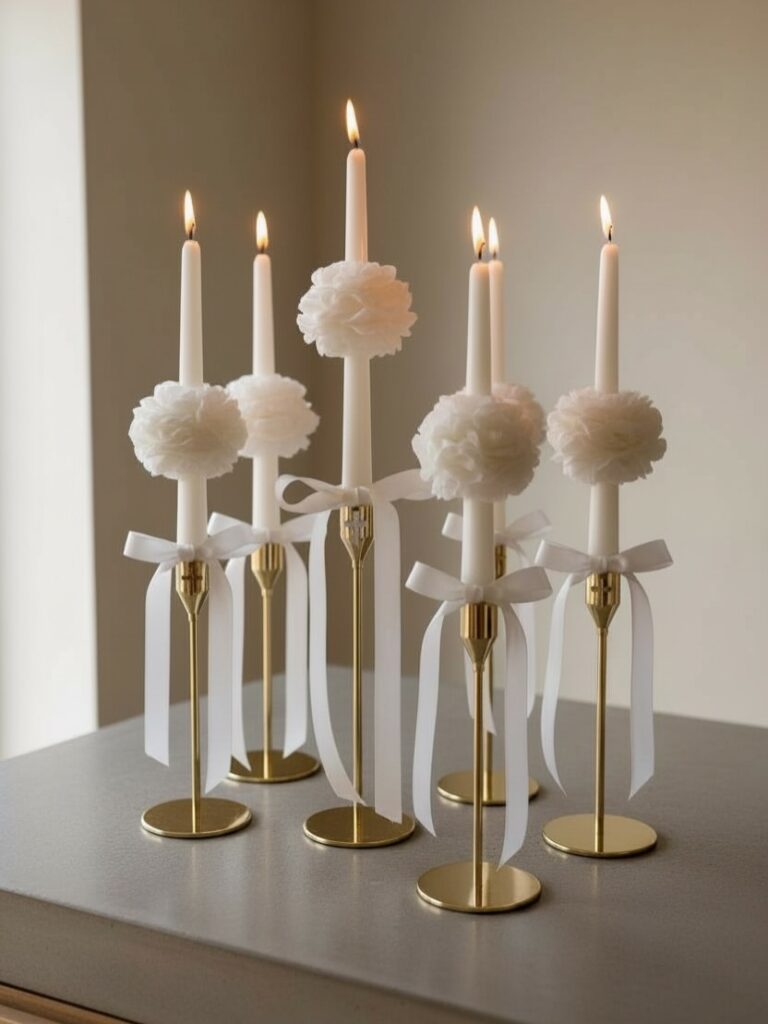 Neutral candles and gourds make a simple yet stylish centerpiece arrangement. Use soft tones like cream, taupe, and pale green for a cohesive look. This idea keeps the table festive without overpowering the food display.